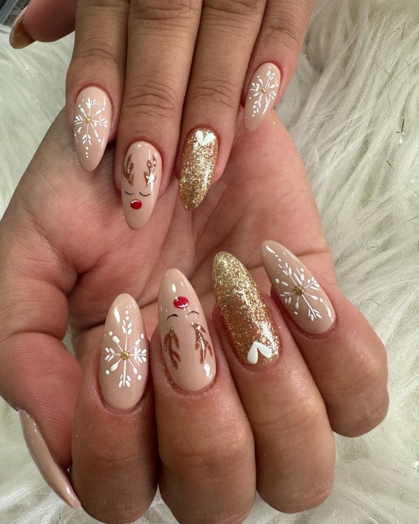 Reindeer nails are another fun choice this year. They’re playful, perfect for mix-and-match sets, and bring instant festive personality.