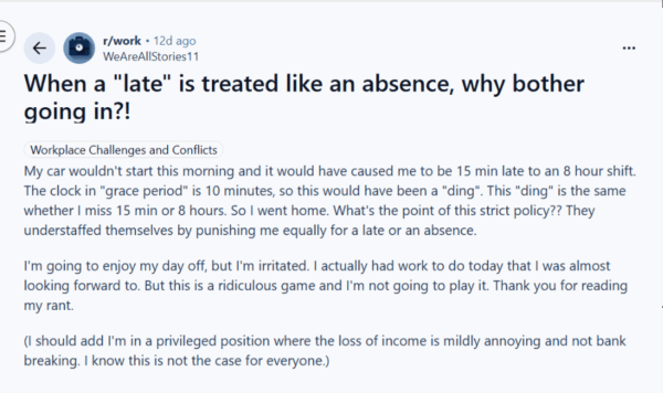 Whether someone was 15 minutes late or missed an entire eight-hour shift, the penalty was exactly the same. The poster explained that when their car broke down and they realised they’d be late, it would count as a full-day absence- leaving them questioning whether there was any point in going in at all.