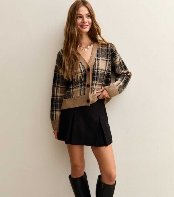 Add a preppy twist to your knitwear rotation with this brown checked cardigan. Cropped to sit perfectly at the waist, it features contrast beige trims, a relaxed fit, and a classic V-neckline.