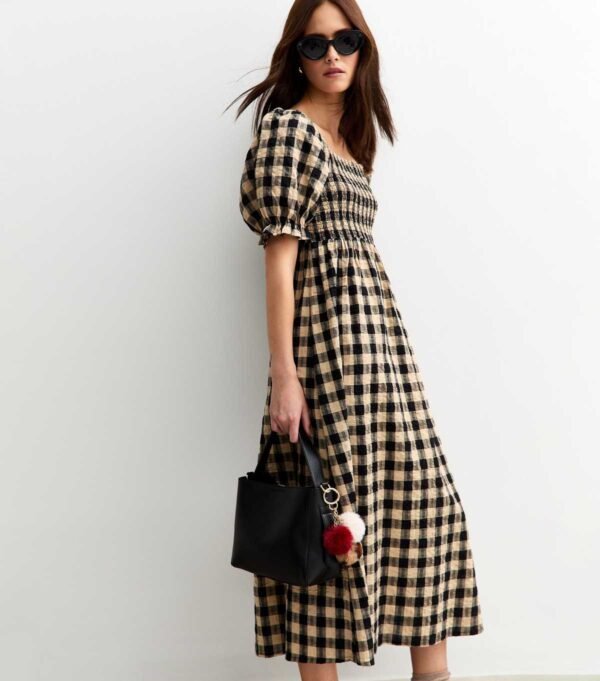 Brown Checked Puff Sleeve Seersucker Midi Dress, £35.99
