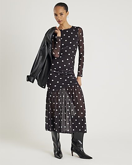 Black Ruched Spot Mesh Midi Dress – £44