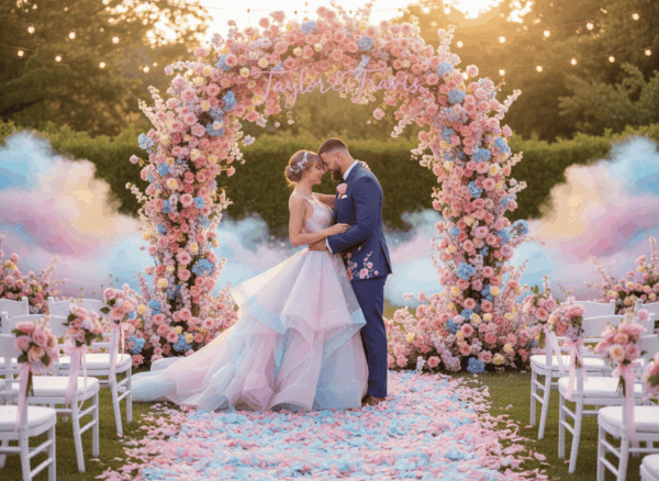 There have been heavy hints that Swift and Kelce’s engagement is inspired by the Lover album era and so it would make complete sense for their wedding to follow a similar theme. The style of the wedding would be romantic and whimsical. The bridal look might feature a soft, pastel-hued gown, while floral arrangements would include light, colorful blooms in delicate compositions along with a statement floral archway. Overall, the setting would feel airy and joyful, with design elements that emphasize intimacy, warmth, and playful elegance.