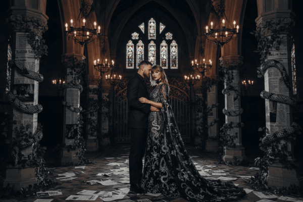 As one of Taylor’s most iconic eras, a Reputation style wedding would certainly get fans talking. We’d expect to see a dark gothic atmosphere. Perhaps a castle or cathedral illuminated only by candlelight, with black roses in every corner. The bridal gown could feature metallic silver and black accents, incorporating subtle nods to the singer’s signature snake motifs, blending bold elegance with the era’s edgy aesthetic.
