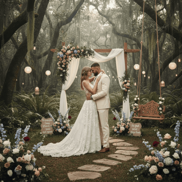 A wedding in the style of Taylor’s Folklore era would be set deep in the woods making the ceremony feel dreamlike, with soft light filtering through the trees and wildflowers scattered along the aisle. Taylor would wear a simple, flowing gown with delicate lace details, paired with a flower crown. Guests might sit on wooden benches or mismatched vintage chairs, and the reception tables would be dressed with linen runners, wildflower arrangements, and glowing candles in glass jars. Music would lean acoustic with guitars, strings, and piano.